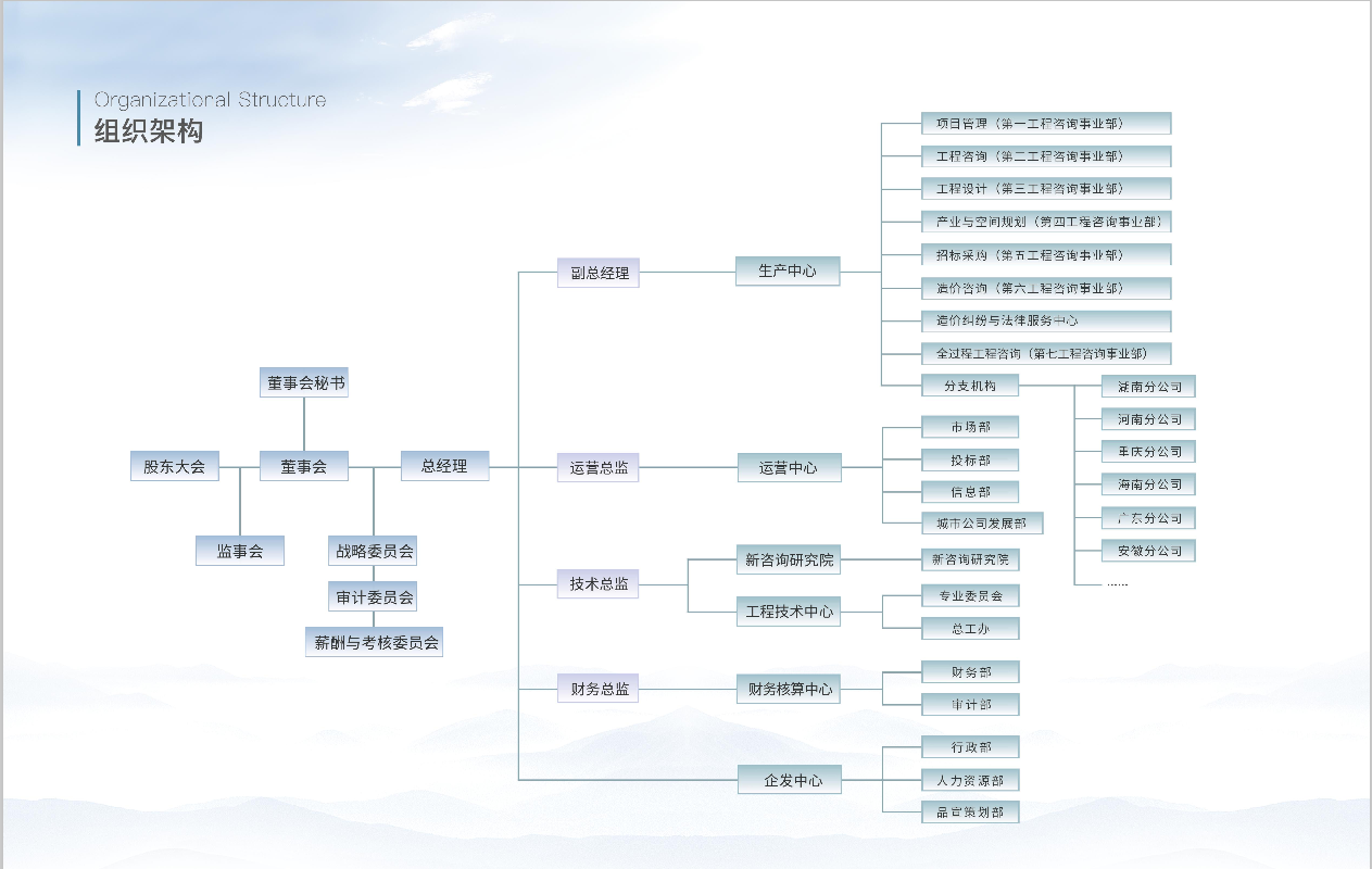 公司下設工程咨詢事業部、招標代理事業部、工程造價咨詢事業部、規劃設計事業部等機構...
